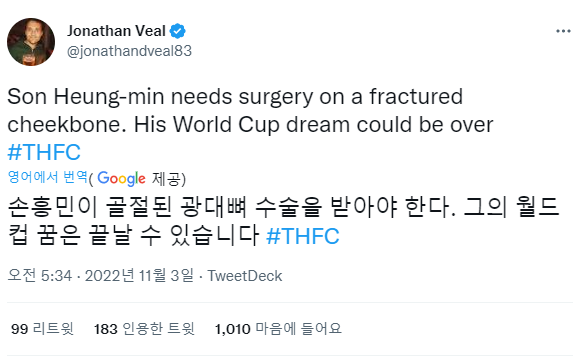 | 손흥민 부상 (안와골절 및 뇌진탕 의심) (0) | 2022.11.02 |