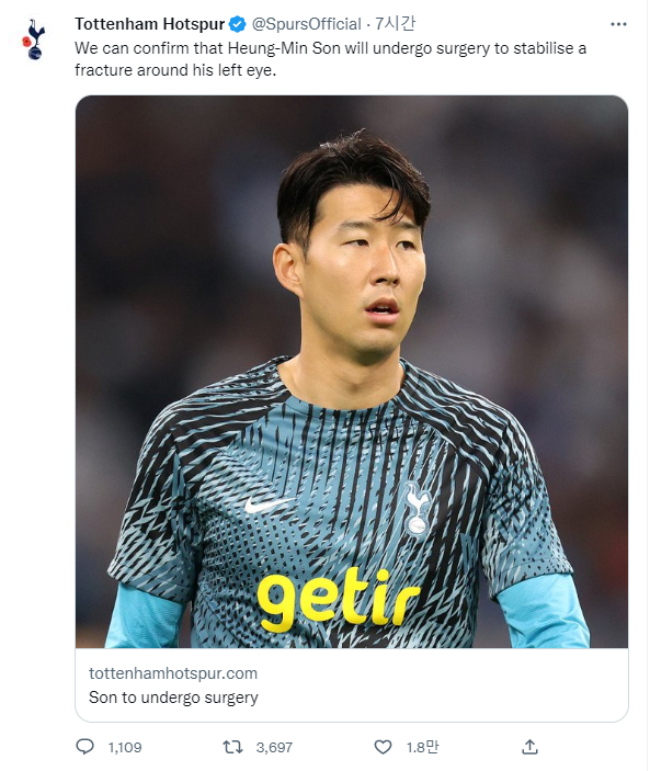 토트넘은 3일에 손흥민이 왼쪽 눈 골절을