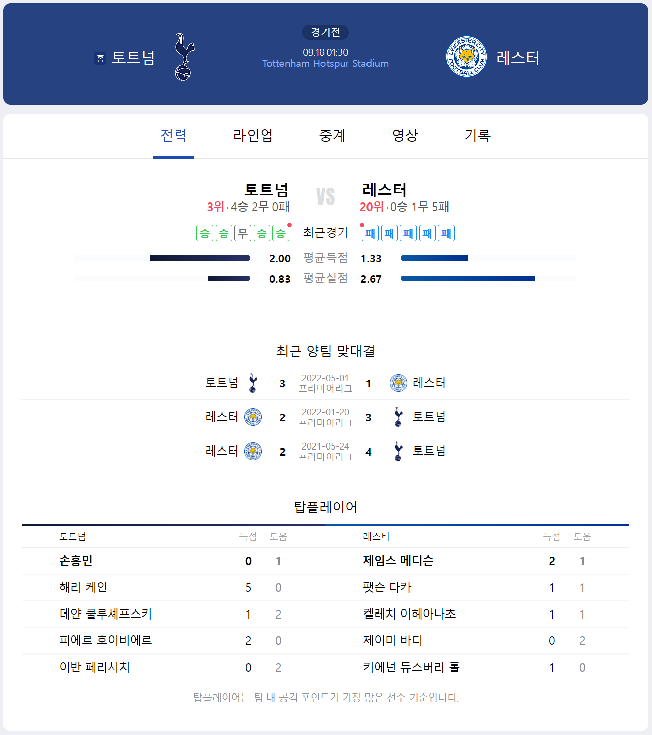 토트넘 (홈) vs 레스터 (원정) : 9월 18일 (일) 새벽 1시 30분